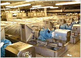 採肉した肉は、タンク内で充分に水さらしを行い、血液、水溶性タンパク質、脂肪、無機質などを除去します。水さらしは、すりみの色調の低下を抑制する大事な効果があります。