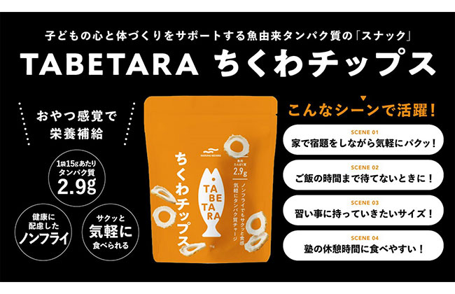 マルハニチロ株式会社(本社所在地:東京都江東区、代表取締役社長:池見 賢)は、"魚を食べたら、いいことがある。"をコンセプトに展開する新ブランド「TABETARA」シリーズの第一弾「ちくわチップス」を株式会社マクアケ(本社所在地:東京都渋谷区、代表取締役社長:中山 亮太郎)が運営するアタラシイものや体験の応援購入サービス「Makuake」にて6月27日(金)正午より発売いたします。
