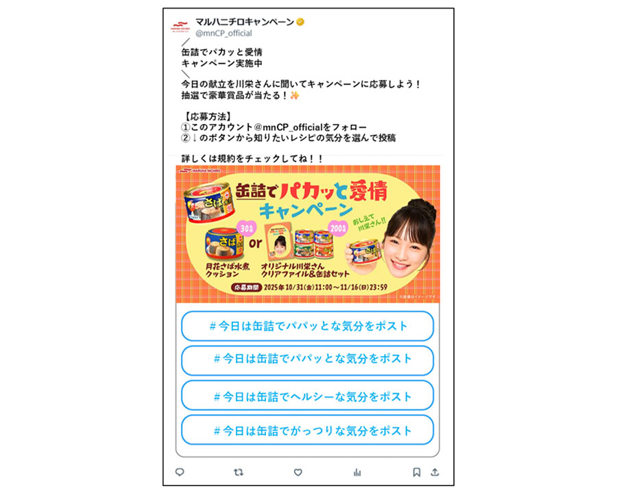 本キャンペーンでは、公式Xの投稿に表示される選択ボタンから、“今日の気分”を選び投稿するだけで、その日の気分にぴったりなマルハニチロの魚介缶詰を使用したおすすめレシピが届くほか、抽選で計230名様に、「月花さば水煮」缶などの賞品が当たります。