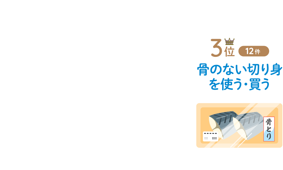 他に、自宅で魚料理を食べるとき、どのようなことで困ったことがあるか聞いたところ、「食べた後のゴミ処理が大変(骨など)」(36.3%)と「きれいに食べられない」(35.6%)が高く、「魚焼きグリルなど調理器具の片づけが大変」(30.3%)が続きました。なかなかきれいに食べられず苦戦したり、食べた後の処理・片づけに手間取ったりしたという人が多いようです。