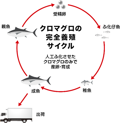 人工ふ化から育った親魚が産んだ卵を再びふ化~稚魚~成魚まで育てることを完全養殖といいます。完全養殖の最も大きなメリットは、卵や稚魚等の捕獲が不要のため、天然資源を減らさずにすむ、環境に優しい養殖技術ということです。