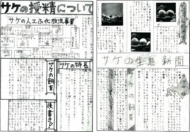 | サケ新聞・・・飼育の様子を新聞で全校に発表しています。 |