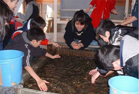 「さけ学習」30年の歴史をもつ、日本でも屈指の小学校。北海道札幌市の東白石小学校を2009年の11月に取材訪問しました。 東白石小学校の「さけ学習」サーモン・プロジェクトの1年をご紹介します。 |