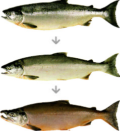 成熟が進み、生殖期に入ると、オスもメスも頭部からほほの顔面部がくすんだオリーブ色になり、体側が赤くなります。特にオスは鮮やかな赤色に変ります。背びれやあぶらびれ、尻びれ、尾びれは黒い緑色です。また、形状も大きく変ります。オスは背部がわずかに盛り上がり、吻(フン)も上部にそりあがり、先はかぎ型に曲がり、あごも上に伸びます。